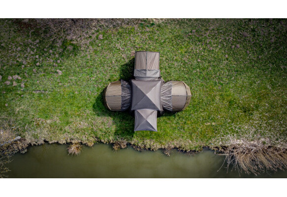 The Mivardi Base Camp Xtreme XXL shelter is an uncompromising solution for staying by the water in any conditions. At its core is an outer skin made from the new M-TEX415 fabric with a unique cracked-design pattern. This material delivers the legendary strength and durability Mivardi bivvy fabrics are known for, while offering a significantly improved 15,000 mm hydrostatic head and reduced weight — a key benefit on a shelter of this size. All seams are secured using FST (Flexible Seam Taping). Wide, flexible tapes bond perfectly to the fabric and reliably seal every seam, even when the shelter is used in very low or very high temperatures. The construction and technical detailing have been refined down to the last detail. Despite its oversized dimensions, the shelter is quick and easy to pitch. And it offers far more than just extra space, a door and windows. At its heart is an exceptionally stable frame with double uprights, linked by spreader poles with solid clips at both ends. These significantly reinforce the structure and reduce flex in the uprights. Two of the spreader poles are fitted with practical Velcro rod holders. All main frame sections are telescopic and feature a reliable locking system for quick, secure adjustment. The telescopic design also ensures a compact packed size and makes set-up and pack-down fast and convenient. In extreme conditions, stability can be further increased by using four guide lines. Both pitching and taking down the shelter can be easily handled by one person. The front wall features an opening entrance panel with a huge window, supplied with mosquito mesh, clear PVC and a nylon storm panel. Heavy-duty zips are fitted with ergonomically shaped pullers for quick operation with one or two fingers. The pullers are made from photo luminescent material and glow in the dark after exposure to light. The letterbox-style front panel can be opened at the sides and rolled up in the traditional way, or partially unzipped to allow progressive opening from top to bottom. At the front of the shelter there is a large porch/awning with its own fibreglass frame. When erected, it is supported by two uprights and secured with guy lines. The awning can be folded fully down along the front wall of the shelter, so it doesn’t need to be dismantled every time. A specially designed connection between the awning and the shelter effectively prevents water pooling on the roof, even during heavy rain. The rear and side walls are fitted with large opening windows with nylon covers and mosquito mesh featuring a micro-ventilation function. All three of these letterbox-style panels can also be partially opened or completely removed. Instead of these wall panels, you can attach the unique Mivardi Bivvy Connection Kit sleeves (available separately). These allow easy connection of one, two or three virtually any-size bivvies or brollies to the Base Camp Xtreme XXL shelter. The connection sleeve wraps tightly around the attached bivvy and protects the joint from rain and wind. Additional optional accessories include a set of four internal hanging organisers or a heavy-duty groundsheet. The shelter is supplied as standard in a generously sized carry bag for easy storage and transport. This waterproof, wipe-clean 600D nylon bag is built for tough use.